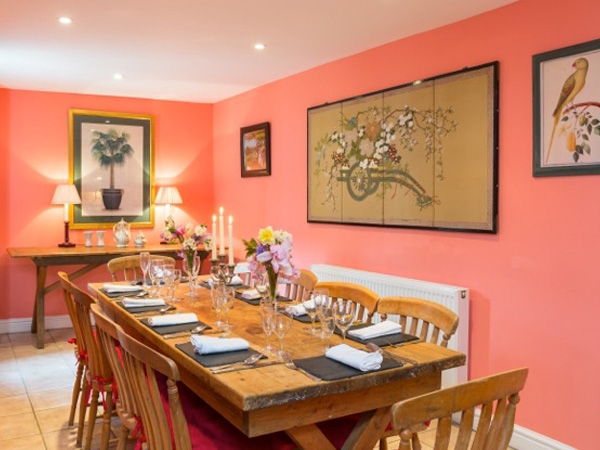 The separate dining room has a refectory table for 8 (with an additional table providing for a total of 14 diners if needed). A door leads to a sheltered private outside seating area – just the spot for a summer lunch. The kitchen has a dishwasher, washing machine and fridge/freezer.
