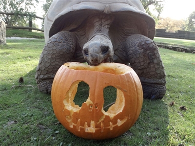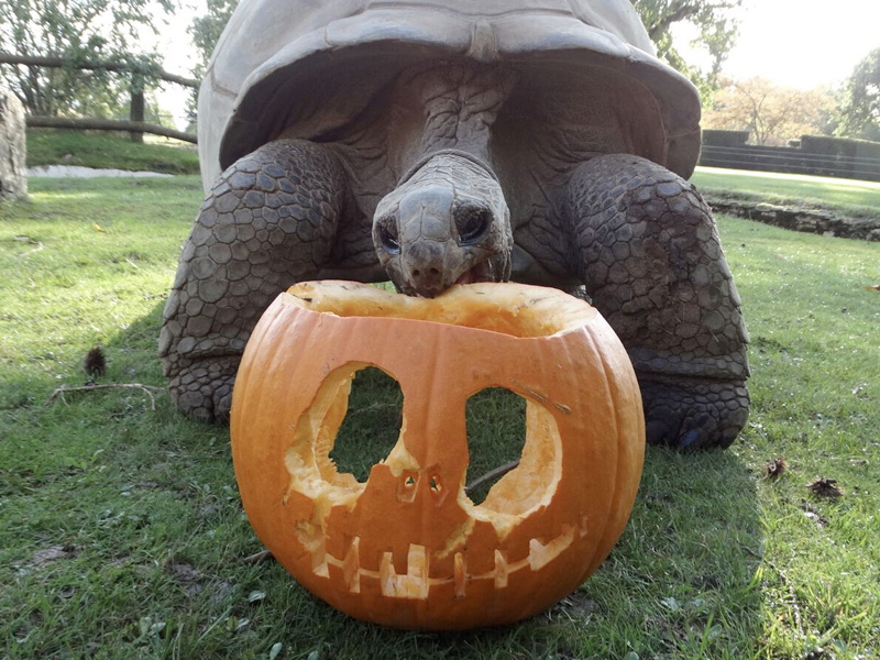 Chris Kibbey, Section Head of Primates and Small Mammals, said: “As well as ghosts, ghouls and witches, the end of October also signifies an abundance of pumpkins! These make great enrichment items for our animals and allows the keepers to be a bit creative too. This year, our Dwarf Mongoose family experienced them for the first time, and the young triplets enjoyed putting their arms through the eye holes to get at the treats inside. The pumpkin offered to the Wolverine didn’t last long as they destroyed theirs to get at the contents. The Giant Tortoises, Tapirs and Giant Anteaters also got into the Halloween spirit with their very own pumpkin treats too.”