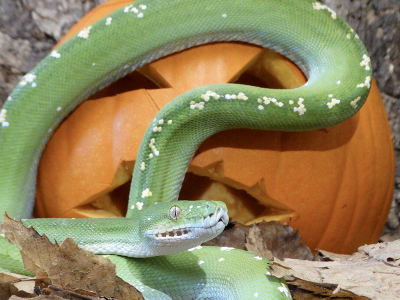Animals treated to special pumpkin enrichments (pumpkins filled with their favourite treats) include: Zorro (Giant Anteater male), Dobby the Binturong, Tapirs Gomez and Lolly, Wolverines (who were treated to a honey-covered pumpkin - they adore honey). Wolverines posses one of the most powerful bites per square inch of any mammal. To keep with the spooky theme, I've included a Green Tree Python (its bright green colouring looks striking on the orange pumpkin) and the first Mossy Frog bred at the Park (and a favourite with the Reptile team), bobbly Bob.