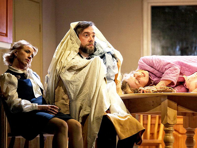 On a third level, Ayckbourn addresses the enduring struggle with middle-aged, middle-class despair.  Some of the most darkly comical moments involve the other characters’ failure to notice the silent, suicidal cris de coeur of Eva (Helen Keeley): for example, Eva’s attempt to gas herself is taken by compulsive-cleaner Jane (Felicity Houlbrooke) as her cue for a spree: “I’ll clean this oven if it kills me”.