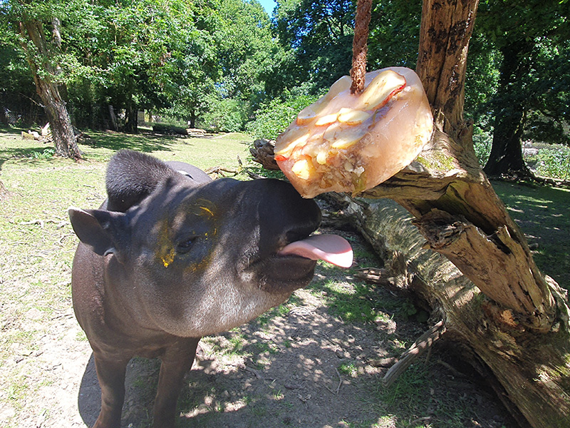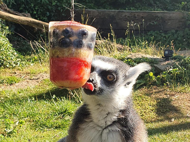 Chris Kibbey, Assistant Animal Manager at Cotswold Wildlife Park & Gardens: "‘It’s hot, hot, hot here in the Cotswolds, and keepers have to be prepared to keep themselves and the animals under their care cool. As always, we ensure all animals have access to adequate shade and plenty of water, but with hot temperatures forecast, it also allows us to be a little inventive with our enrichment. The Lemurs were given frozen fruit popsicles made using ingredients from their normal diet – berries, pear and grapes which they enjoyed. Sometimes simply freezing an animals’ diet in an ice block provides a stimulating challenge for them, as was the case for our Tapirs Gomez and Lolita who devoured their melon, pear and banana frozen treat in no time. Watermelon is a delicious summer treat and perfect for our Meerkats who use their strong claws to break through the skin before using their snout and tongue to lap up the insides. For the first time, our Ring-tailed Lemur twins, born earlier this year, enjoyed their first taste of watermelon too".