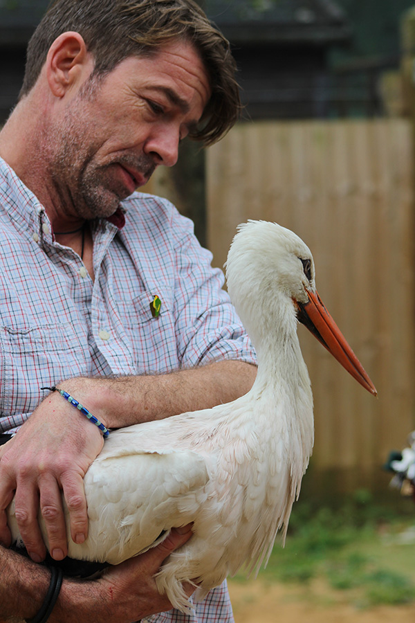 Curator Jamie Craig with a White Stork bred at Cotswold Wildlife Park ahead of its release in Sussex for the White Stork Project