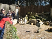 A group of King Penguins recently arrived in their temporary home in Bourton-on-the-Water, from Edinburgh Zoo while their enclosure undergoes essential maintenance. Upon their arrival they spent a couple of weeks in quarantine before being introduced to the 14 King penguins who already reside at Birdland Park & Gardens. On the 6 April the decision was made to march the penguins to their new enclosure from their quarantine quarters. Expecting that this could take up to an hour the keepers were surprised when they waddled in an orderly fashion in all of 8 minutes!